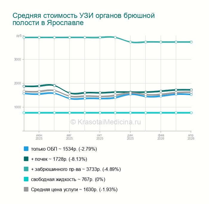 Сделать УЗИ органов брюшной полости в Ярославле можно в 81 клинике. Средняя цена - 1589р. (+5.86% за последние 3 месяца). Всего найдено 122 цены от 500 до 14000 руб.